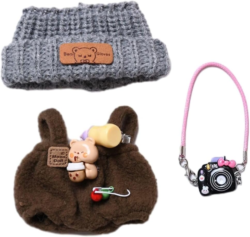 • 【サイズ適応】17cmのぬいぐるみにぴったりフィットし、着脱も簡単です。セット内容:茶色のボトルオーバーオール+灰色のクマの毛糸の帽子+黒いカメラ